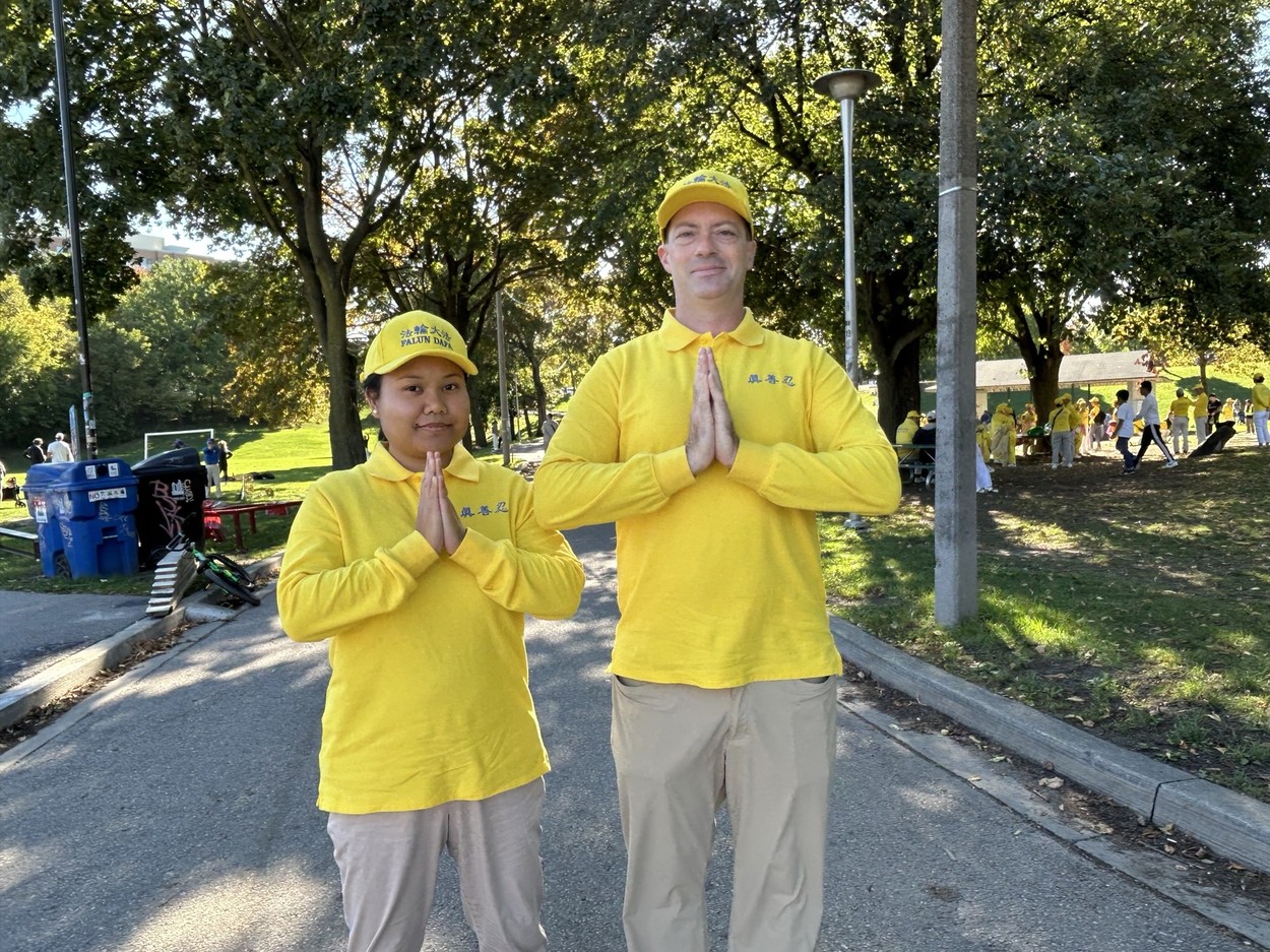 當天,不同族裔、不同年齡的法輪功學員身著鮮亮的黃色煉功服,匯集在綠草如茵的克里斯蒂皮茨公園(Christie Pits Park),圍繞在「法輪大法好」的巨型橫幅下,通過視頻向尊師李洪志先生表達中秋祝福:「恭賀師尊中秋快樂,法輪大法好。」