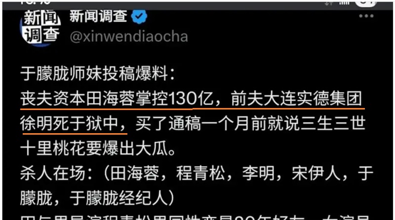 根據于朦朧的師妹投稿爆料:「喪夫(田海蓉的前夫徐明)資本田海蓉掌控130億,前夫大連實德集團徐明s(死)在獄中,買了通稿一個月前就說三生三世十里桃花要爆出大瓜。」