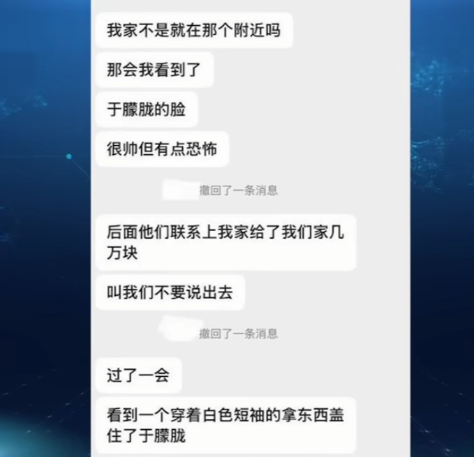 于朦朧案發小區居民的爆料案發時看到于朦朧的臉,案發後收到封口費。(視頻截圖)
