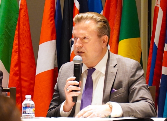 2025年10月3日,國際扶輪社在華盛頓DC的威斯汀酒店放映獲獎紀錄片《國有器官》。 圖為英文大紀元資深編輯楊傑凱(Jan Jekielek)在現場和觀眾互動環節中。(張奕/大紀元)