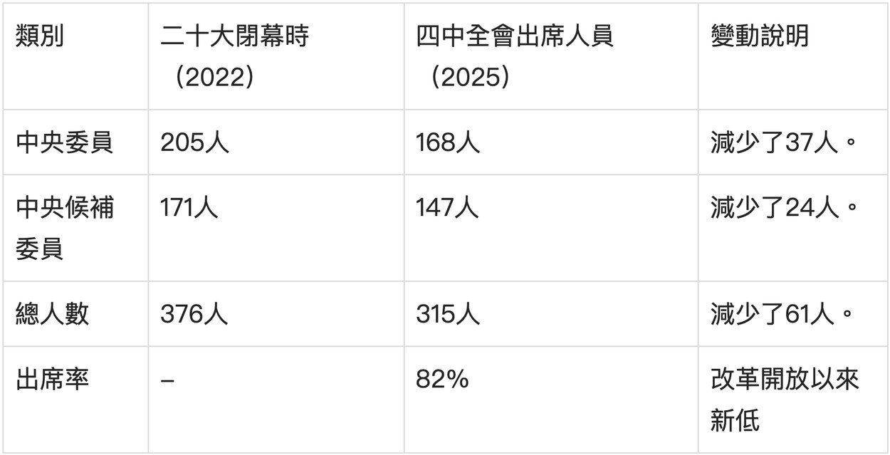 根据官方资料,二十届中央委员会有205人,官方报导出席这次会议的只有168人,其中一人去世,36人缺席,只有10个人是公布被开除了党籍,这样剩下26个高官失踪。按照惯例,这些人应该是出问题了。