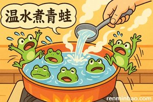 溫水煮青蛙,有青蛙已經驚醒,「總加速師」依舊繼續加熱水。(人民報製圖)