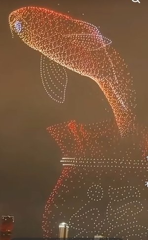 10月6號,大陸重慶舉辦無人機表演,夜空中突然出現一條巨大的,五彩繽紛的「錦鯉」圖案,在場觀衆隨即激動的高喊「于朦朧」。(視頻截圖)