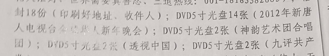 甘肃陇西县法院2013年的一份判决书显示,一名陈姓法轮功学员被冤判三年六个月。法庭文件上显示被作为证据的扣押物品中,除有大法书籍、真相币等资料外,有5寸DVD光盘14张(2012年新唐人电视台全球华人新年晚会),5寸DVD光盘2张(神韵艺术团合唱团演唱会)等。