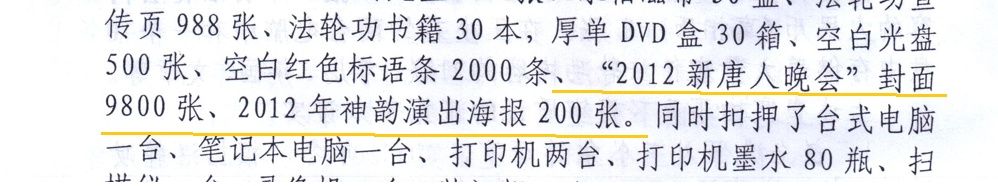 河北泊头市法院2012年的一份判决书显示,一名王姓法轮功学员被非法判刑三年。法庭文件上显示的证据中,除了法轮功书籍、“真、善、忍”挂图等,与神韵相关的证据包括《2012年新唐人晚会》光盘100张,《2012年新唐人晚会》封面9,800张、2012年神韵演出海报200张等。