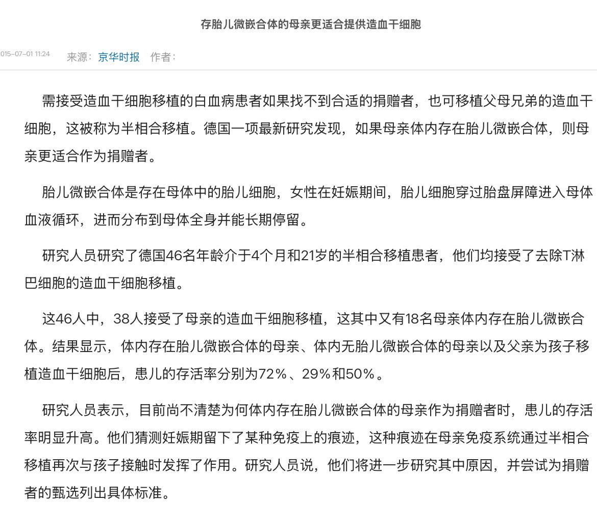 大陆媒体京华时报早在2015年7月1日就报道过关于“胎儿微嵌合体的母亲更适合提供造血干细胞”。(网络截图)