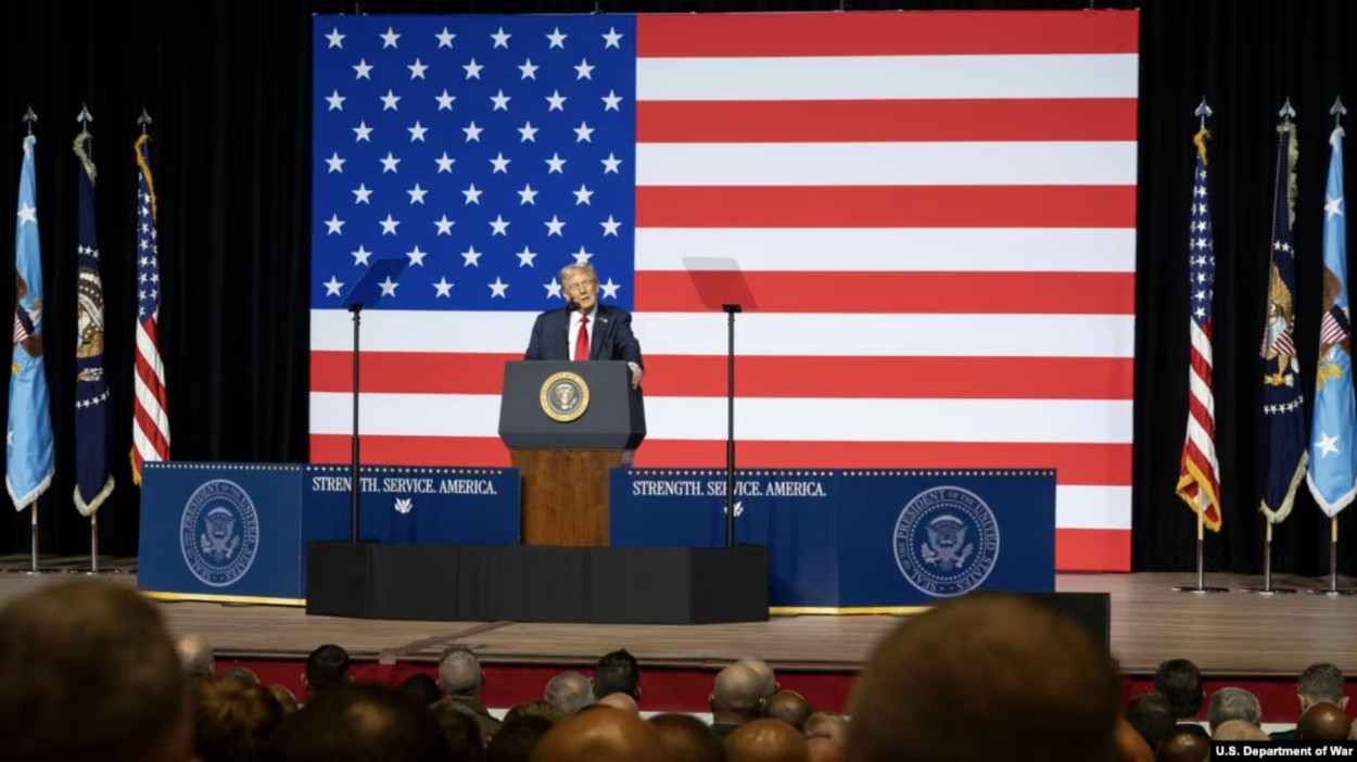 川普总统2025年9月30日对美国军队将领发表讲话。