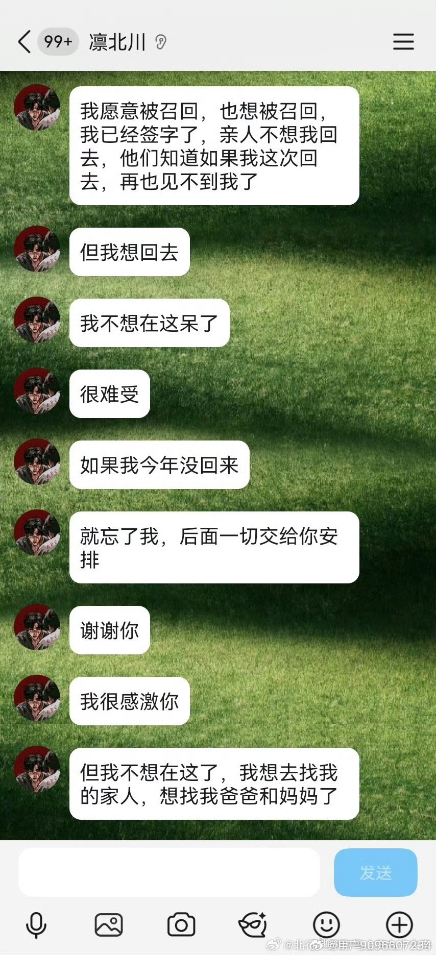我们来看看凛北川是怎么说的:“我愿意被召回,也想被召回,我已经签字了,亲人不想我回去,他们知道如果我这次回去,再也见不到我了。但我想回去,我不想在这呆了,很难受。如果我今年没回来,就忘了我,后面一切交给你安排。谢谢你。但我不想在这了,我想去找我的家人,想找我爸爸和妈妈了。”