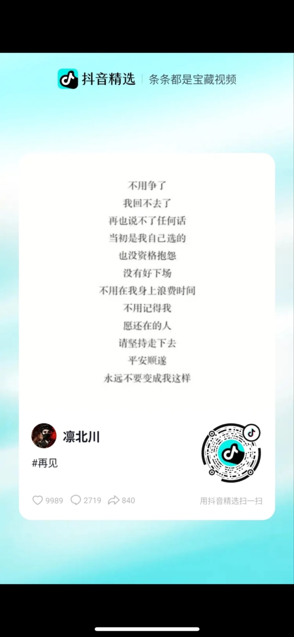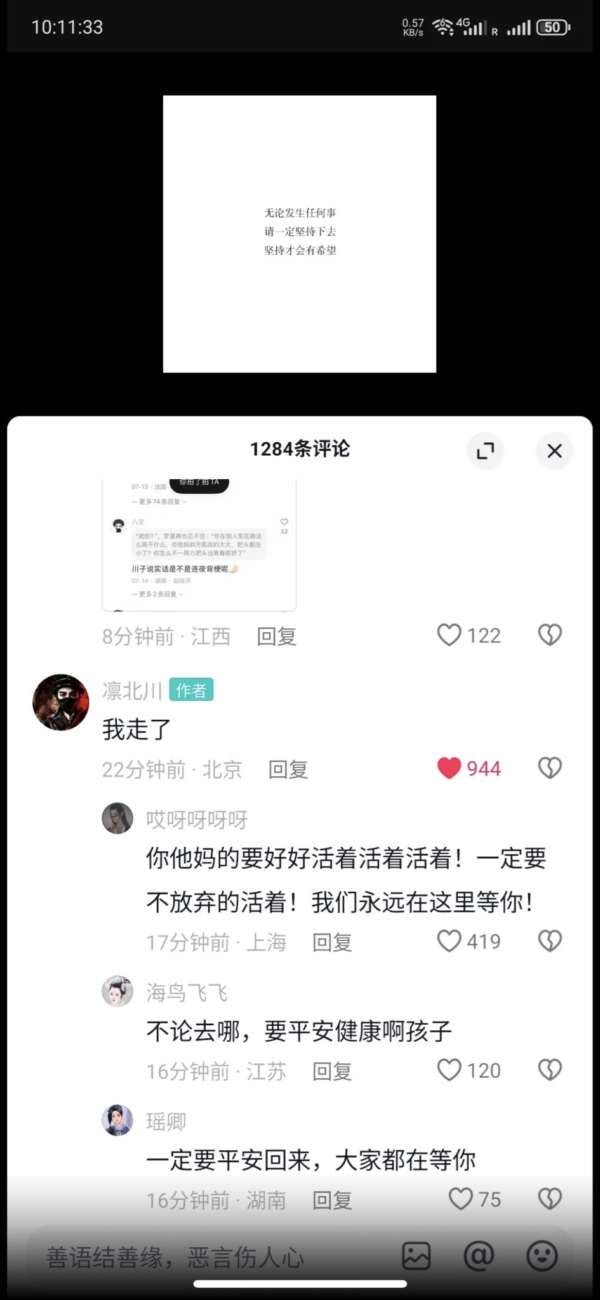 11月22号,大陆B站传出抖音号“凛北川”发出的留言截图。其中一再出现“再见”“我走了”“回不去(家)了”等词句,但要求其他网友继续坚持(为于朦胧讨公道)。这段视频很快就被删除,有网友及时录制了下来。目前,凛北川所有微博账号全部被清除。