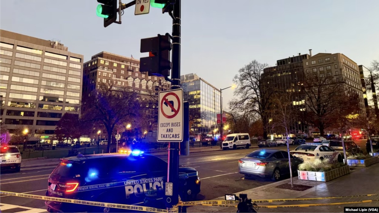 部署在美國首都的兩名西弗吉尼亞州國民警衛隊員11月26日下午在距離白宮幾個街區的法拉格特廣場附近遭槍擊。警方封鎖了事發地的附近區域。(美國之音記者利平拍攝)