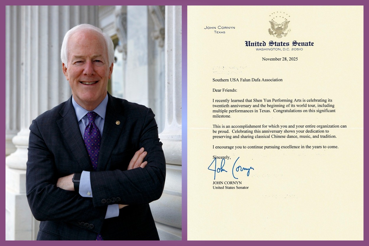 美國資深聯邦參議員約翰‧科寧(John Cornyn)於11月28日向神韻德州主辦方發來賀信,祝賀神韻藝術團迎來二十周年的重要里程碑。(大紀元合成)