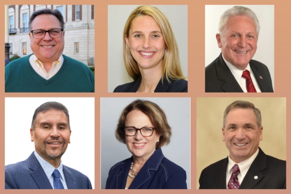 2025年12月,神韵即将重返沃特伯里市演出前,康州六个城市分别向神韵艺术团颁赠褒奖证书。(自上至下,左起)康州沃特伯里市市长Paul K. Pernerewski, Jr.、斯坦福市市长Caroline Simmons、诺沃克市市长Harry W Rilling、纽不列颠市市长Bobby Sanchez、布里斯托尔市市长Ellen Zoppo-Sassu和纽伦敦市市长Michael E. Passero。(大纪元合成)