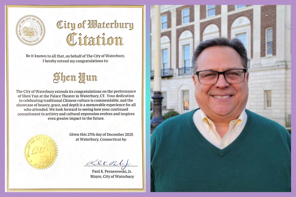 2025年12月,康州沃特伯里市(Waterbury)市长Paul K. Pernerewski, Jr.签发“神韵艺术团褒奖令”。(大纪元合成)