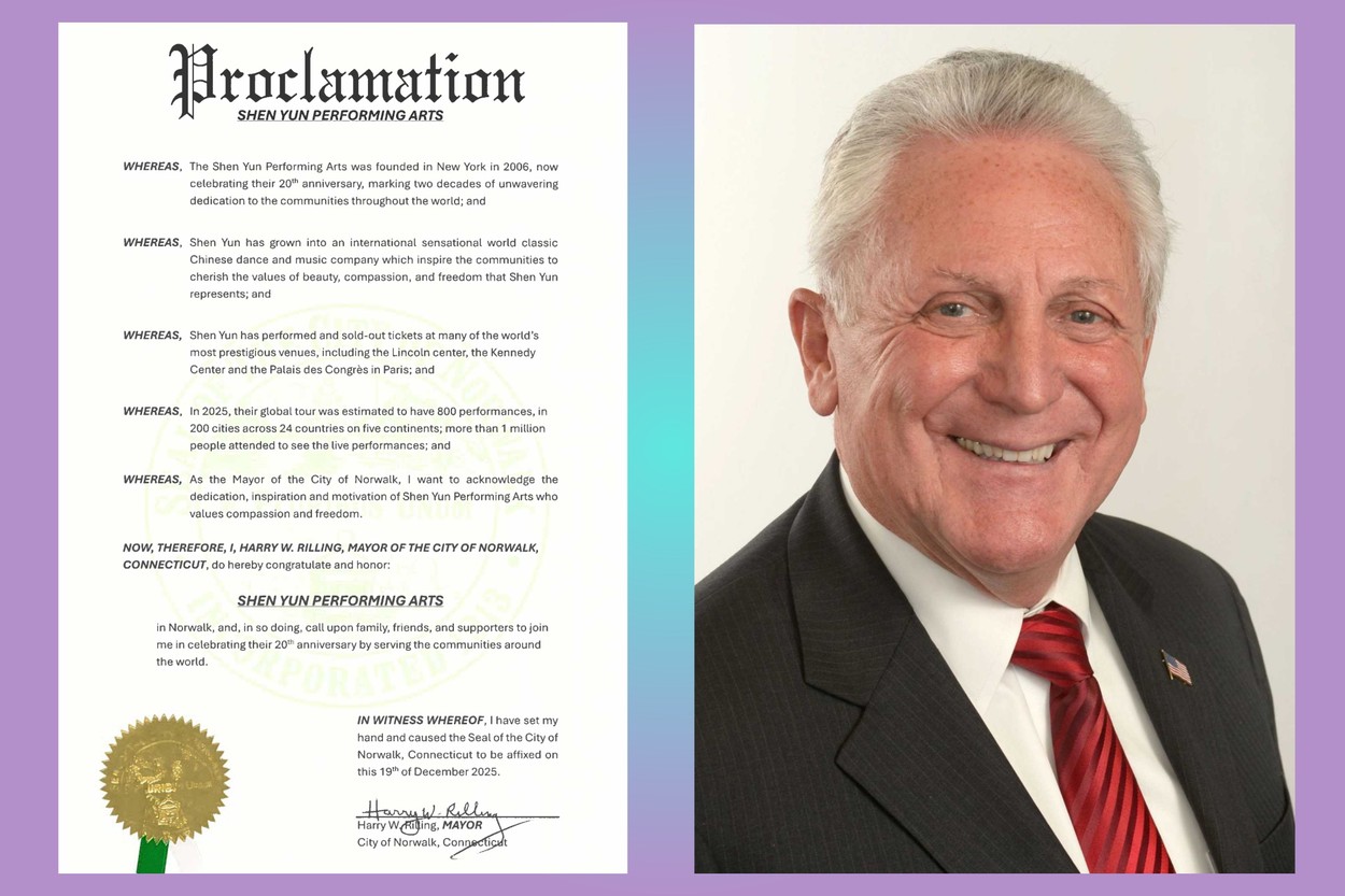 2025年12月,康州诺沃克市(Norwalk)市长Harry W Rilling签发“神韵艺术团褒奖令”。(大纪元合成)