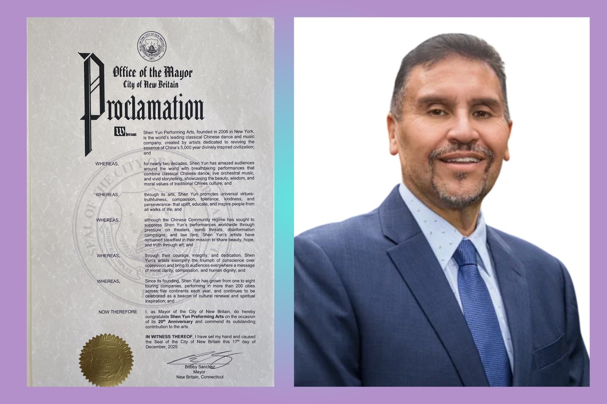 2025年12月,康州纽不列颠市(New Britain)市长Bobby Sanchez签发“神韵艺术团褒奖令”。(大纪元合成)