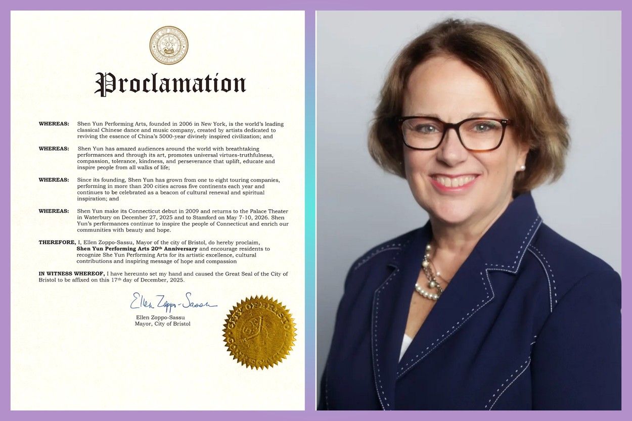 2025年12月,康州布里斯托尔市(Bristol)市长Ellen Zoppo-Sassu签发“神韵艺术团褒奖令”。(大纪元合成)