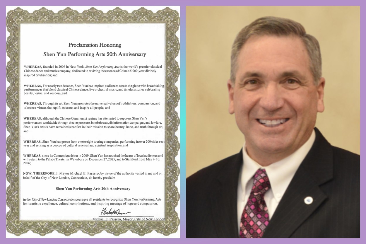 2025年12月,康州纽伦敦市(New London)市长Michael E. Passero也在褒奖令中“敬贺神韵艺术团创立20周年”。(大纪元合成)
