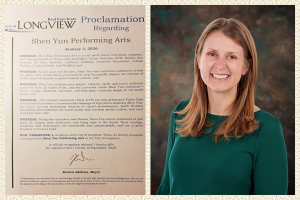 神韻2026演出季開啟前,德州朗維尤市市長克莉絲汀‧石原(Kristen Ishihara)褒獎神韻。(大紀元合成)