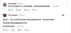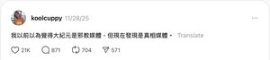 【人民報消息】近日社群平台「脆(Threads)」在台灣出現一波向大紀元與法輪功「道歉」的討論聲浪。多名網友接連發文,坦言過去對相關報導與行動存有懷疑,近期因接觸更多資訊而轉變觀念。帖文引發大量回應與轉傳。 大紀元是「真相媒體」 網友帳號「koolcuppy」11月28日發文表示,「我以前以為覺得大紀元是XX媒體,但現在發現是真相媒體」(相關帖文),帖文獲得2萬多個愛心回應。 隔日有網友「eeminuan」指出,實體報紙經營不易,「尤其要講真話就可能會觸動到利益團體」,並提到即便在香港實施《國安法》後,香港大紀元仍持續在報攤販售實體報紙,「即使有記者被打、印刷廠被砸、恐嚇威脅還堅持著」,同時也提到台灣目前仍能在義美門市買到。