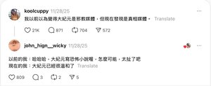 網友「wendy._.1202」11月30日發文說,「要年末了……更多事浮出檯面,再來道歉一次」,她也回顧自己4月曾發文指出,過去在台北101前看到相關畫面時,曾認為「太血腥誇張」,直到近期大量資訊出現,「才發現事實這麼可怕」,並主動分享相關影音連結協助擴散。 網友「jazzmi_liu」則透過多篇留言,整理自己對法輪功遭迫害議題的理解,提到「中共鎮壓法輪功」、「從假新聞污衊到下令消滅」、「包含酷刑與活摘器官」等說法,並表示相關內容是在閱讀大紀元報導後才進一步認識,「裡面真的水很深」。 也有網友留言轉述過往經驗。「john_hign__wicky」寫道,「以前的我:哈哈哈,大紀元寫恐怖小說喔,怎麼可能;現在的我:大紀元已經很溫和了。」