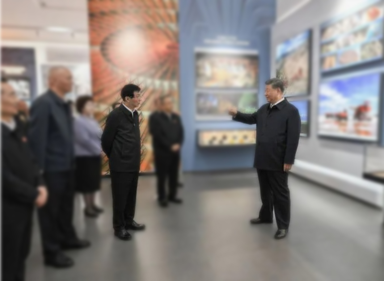 2025年9月24日上午,中共党魁习近平(右)参观新疆维吾尔自治区成立70周年主题成就展。现场官员只有王沪宁(左)背著双手,以上级俯视下级的姿态盯著正在讲话的习近平。(网络图片)