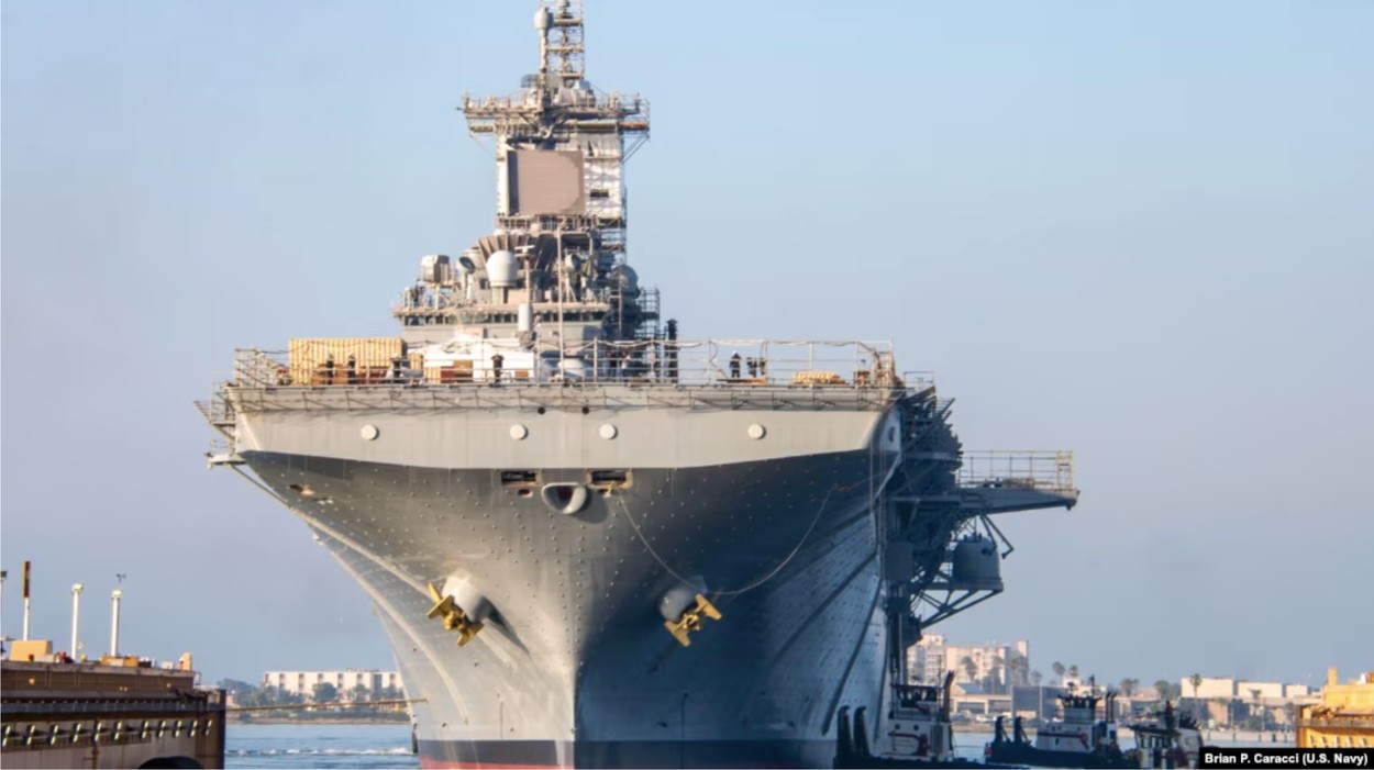 資料照片:美國海軍兩棲攻擊艦「埃塞克斯」號離開貝宜系統公司位於加利福尼亞州聖迭戈的乾船塢。(2023年9月8日)