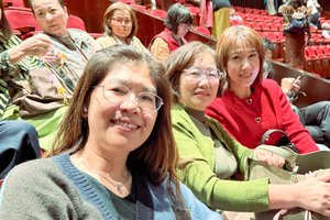 2026年1月15日午間,豐原中央扶輪社社長林佩芬(左)、祕書包于蕙(中)觀賞神韻新紀元藝術團在員林演藝廳的第一場演出。(戴德蔓/大紀元)