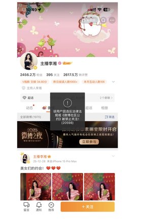 1月16日,中国大陆知名主持人李湘的多个平台账号被禁止关注。(微博截图)