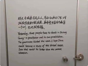 1月6日网上流传的一张图片中,有人用中英文在一扇门的背面写了一段话,内容是:“昨天赤城县冻死三人,爷孙仨,两孙7岁、4岁,政府全面封锁消息,真希望中国成为美国一个州,也比现在强。” “赤城县”隶属于河北北部的张家口市,紧邻著冬奥会举办地崇礼,当前节气已进入三九,崇礼的最低温已经降至零下14度到零下30度之间,赤城县的最低温度也应该差不多。 标语中有一句话耐人寻味:“真希望中国成为美国的一个州,也比现在强”,这说明有人已经觉醒了,只要共产党存在一天,中国人民就过不上好日子,只有解体中共,中国人才能远离灾祸。 中共前总理李克强在2020年指出,中国至少有6亿人的平均月收入为1000元左右,在中等城市连交付每月房租都困难。农村人收入更低,生活更加艰难,老人的养老金每月只有百余元,他们吃不饱,还怎么又多余的钱用来烧煤气取暖呢?只能用单薄的身体抵抗漫长的寒夜。如果这6亿人因为烧不起天燃气而看清楚了中共的邪恶,起来反抗中共,或者声明退出中共邪恶组织,几天功夫就可以解体中共。 (人民报首发)△