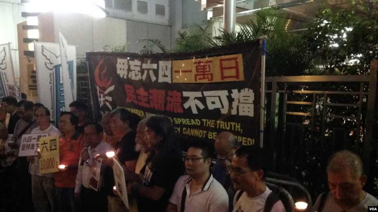 資料照片:2016年10月20日晚,香港市民支援愛國民主運動聯合會在中共中央政府駐港機構中聯辦正門外,舉行紀念「六四」一萬日的燭光悼念活動。(VOA)
