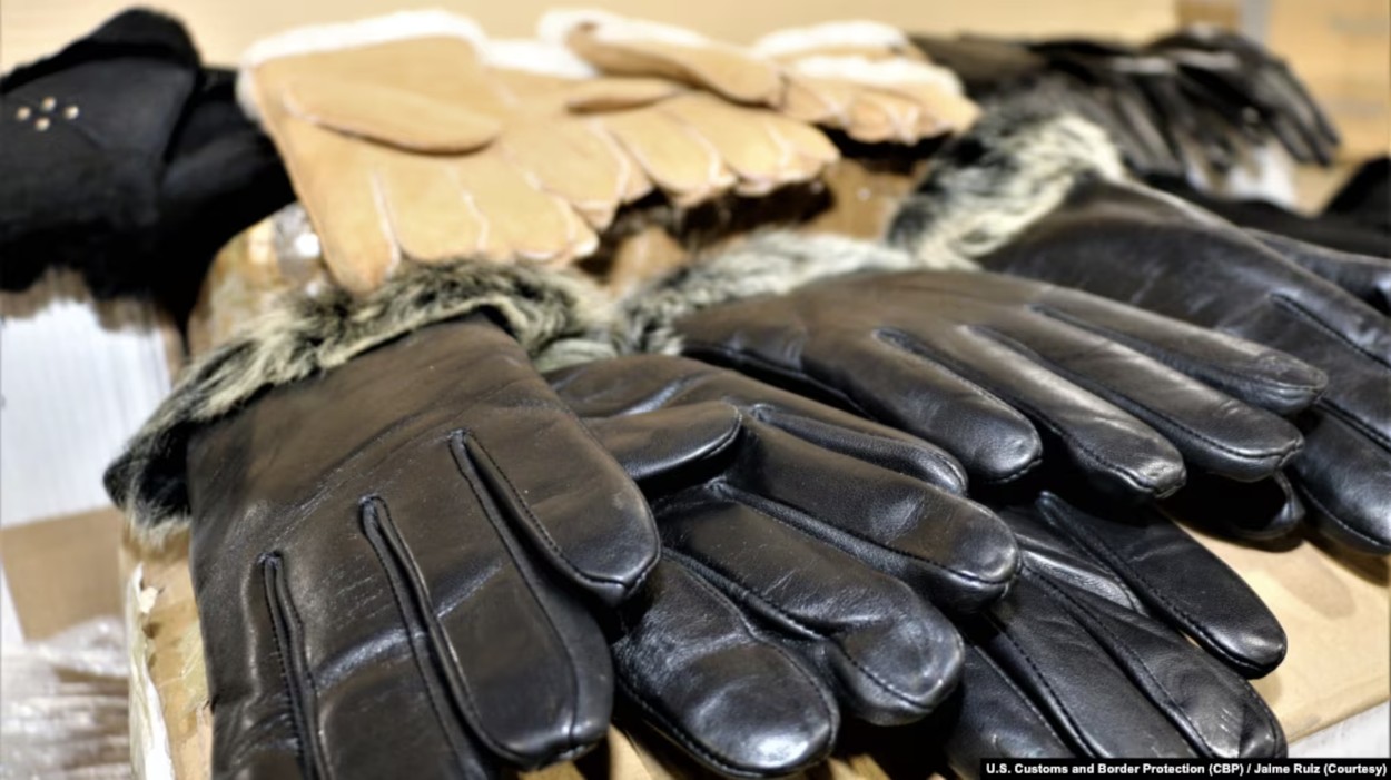 资料照片:美国海关和边境保护局宣布在洛杉矶/长滩海港扣押源自新疆涉嫌为强迫劳动产品的一批女式皮手套。(2020年9月15日)