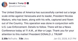 美国总统川普周六(3日)证实,美军对委内瑞拉发动空袭,委内瑞拉总统马杜罗及妻子已被逮捕。(来自真相传媒川普账号)