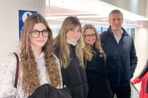 2026年1月4日下午,神韵巡回艺术团在拉脱维亚首都里加(Riga)的戴列斯剧院(Dailes Theatre)上演了今年的第三场演出。拉脱维亚高级警司Jānis Blumbergs(右一)和太太Agnes(右二)、艺术家Mikus Krastiņš(左一)以及岳母一起观看了演出。(王亦笑/大纪元)