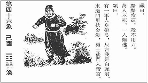 讖曰:「黯黯陰霾,殺不用刀。萬人不死,一人難逃。」而頌曰:「有一軍人身帶弓,只言我是白頭翁。東邊門裡伏金劍,勇士後門入帝宮。」(見圖一)