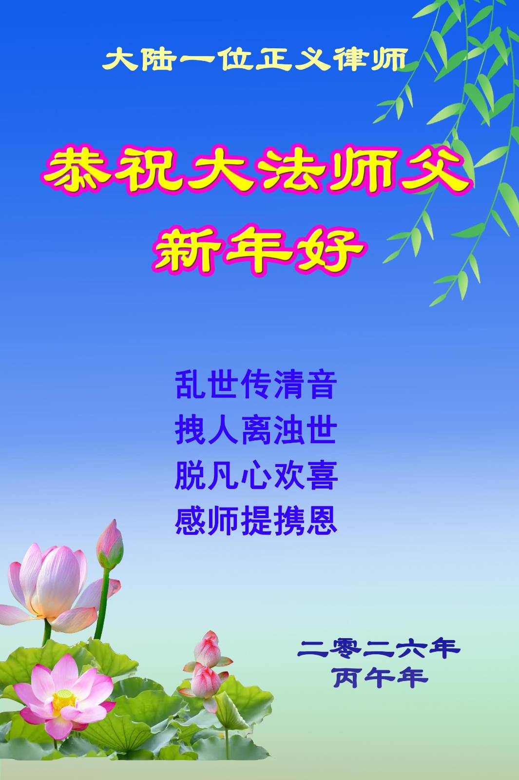 法輪功是人類的希望 「我們想念李大師!」 大陸民眾趙光明向大紀元發來賀信表示:「恭祝李大師新年快樂,馬年吉祥安康!」 「法輪功是人類的希望,希望李大師早日回到中國大陸,法輪功早日有一個合法的修煉環境。」 趙光明補充說,「李大師一定不要忘了我們!我們想念李大師!」 在這片苦難大地上 大法是希望之光 大陸人權律師藍寧給大紀元寄來賀卡。他寫道:「我們之所以對中國抱有希望,正是因為大法的光芒在這片苦難的大地上閃耀著,這是希望之光。」 「2026年註定是不平凡的,祝福大法師父馬年安康!」