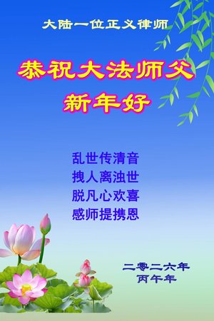 【人民報消息】中國黃曆新年到來之際,大陸多位人權律師和民眾接受採訪並發來賀信,表達他們對法輪大法及創始人李洪志先生的崇敬和祝福。 據大紀元記者程靜、洪寧採訪報導他們表示,在這片苦難大地上,法輪大法如暗夜裡的燈塔,是人類的希望,引領眾人為正義堅守,為真理疾呼;並表示「我們想念李大師!」「恭祝李大師新年快樂!」「盼望早日回到大陸」。 法輪大法(又稱法輪功)是由李洪志先生於1992年5月在中國長春傳出的佛家上乘修煉大法,是以「真、善、忍」為指導原則修煉,迄今已洪傳逾110個國家,獲得萬個以上褒獎,億萬人民身心受益。每逢佳節,人們紛紛表達對李洪志先生的感恩。 大法洪傳 未來有盼望 大陸人權律師王興給大紀元發來賀卡。王興說,「在社會扭曲、人心敗壞的當今,大法得以洪傳、真善忍被人信奉,做人有操守,對未來有盼望。」 「因此,各類人群都應該感謝李大師。」 「祝李大師新年快樂!」