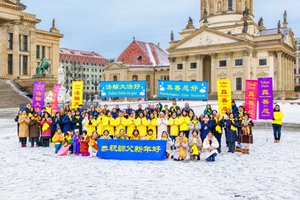2026年中國新年之際,德國柏林部分法輪功學員恭祝李洪志師父過年好。(張清颻/大紀元)
