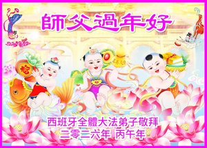 西班牙全體法輪功學員恭祝李大師過年好。(明慧網)