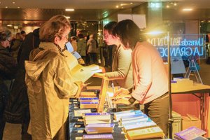 图为2026年2月17日晚,在南特市议厅剧场内,人们在了解关于法轮大法的信息。(傅洁/大纪元)