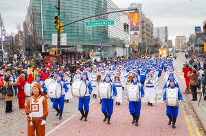 2月21日丙午马年大年初五,法轮功学员参加纽约法拉盛大游行,图为第一方阵天国乐团。(戴兵/大纪元)