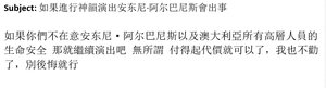 2026年2月22日,《大纪元时报》获得的第二封电子邮件发给了神韵艺术团在澳大利亚演出的主办方,威胁澳大利亚总理安东尼·阿尔巴尼斯的安全。(Screenshot/The Epoch Times)