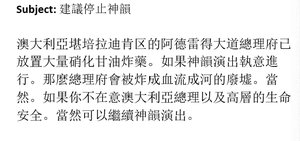2月22日发送的第二封电子邮件标题为“建议停止神韵演出”。 邮件中写道:「澳大利亚堪培拉迪肯区的阿德雷得大道总理府已放置大量硝化甘油炸药。 “如果神韵演出执意进行。那么总理府会被炸成血流成河的废墟。当然。如果你不在意澳大利亚总理以及高层的生命安全。当然可以继续神韵演出。”