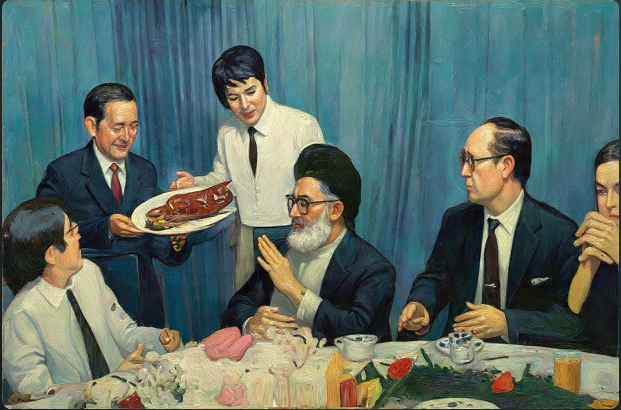 时评人士吴祚来表示:老朋友又少了一个,和平门烤鸭店挂著的这幅照片也称绝版了。1989年5月,伊朗最高领袖哈梅内伊访华,在会晤结束后,哈梅内伊接受邀请前往和平门烤鸭店吃烤鸭。(此图是AI仿制图)
