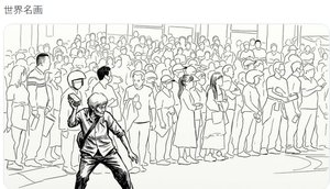 老奶奶单挑特警,网友处理成黑白线稿,配上“世界名画”。(网络图片)