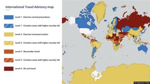 美國國務院最新發布的國際旅行建議地圖概述了不同目的地的旅行建議級別(2026年3月28日)