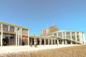 2026年4月8日下午,神韵环球艺术团在德国菲森新天鹅堡音乐厅(Festspielhaus Neuschwanstein)上演了今年当地第二场演出。这天,阳光明媚,春意盎然。图为悬挂巨型展板喜迎神韵的新天鹅堡音乐厅外景。(君卓/大纪元)