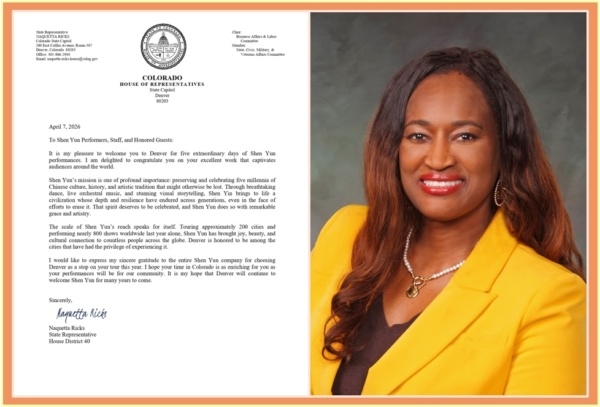 2026年4月7日,科罗拉多州众议员Naquetta Ricks发来贺信,恭贺神韵艺术团莅临科罗拉多州。图为Naquetta Ricks议员和其贺信。(公有领域、大纪元)
