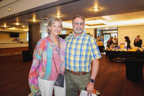 2026年4月8日下午,前银行总裁兼首席执行官、扶轮社社长Donna Petrocco(左)与友人Bill Bathurst一起欣赏了神韵北美艺术团在美国丹佛市布尔剧院(The Buell Theatre)的首场演出。(林慧心/大纪元)