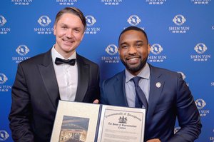 2026年4月15日晚,神韻北美藝術團在費城進行本季的首場演出,賓州州眾議員Anthony Bellmon(右)到劇院現場給神韻藝術團頒贈褒獎。(新唐人電視台)